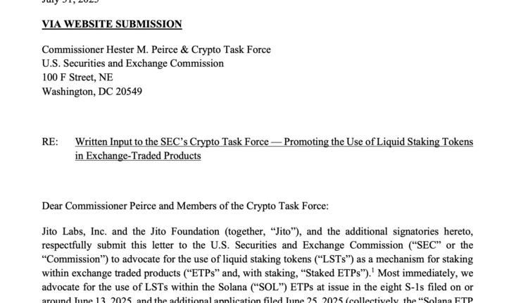 Solana infrastructure provider Jito Labs, asset managers VanEck and Bitwise and two other stakeholders are appealing to the US Securities and Exchange Commission (SEC) to allow liquid staking for Solana exchange-traded products (ETPs).