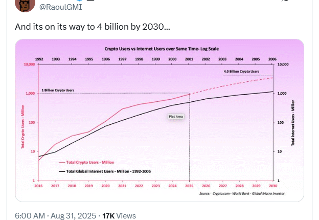 In an X post on Sunday, Pal shared data comparing the adoption rate of crypto users to internet users after each innovation hit 5 million users.