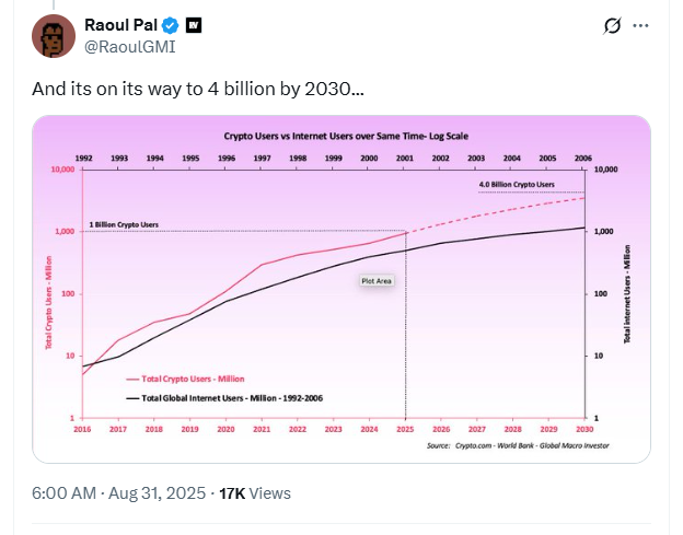 The total number of crypto users could hit the 4 billion mark by 2030, according to Raoul Pal, founder and CEO of the financial knowledge and education platforms Real Vision and Global Macro Investor.