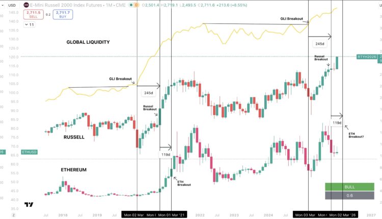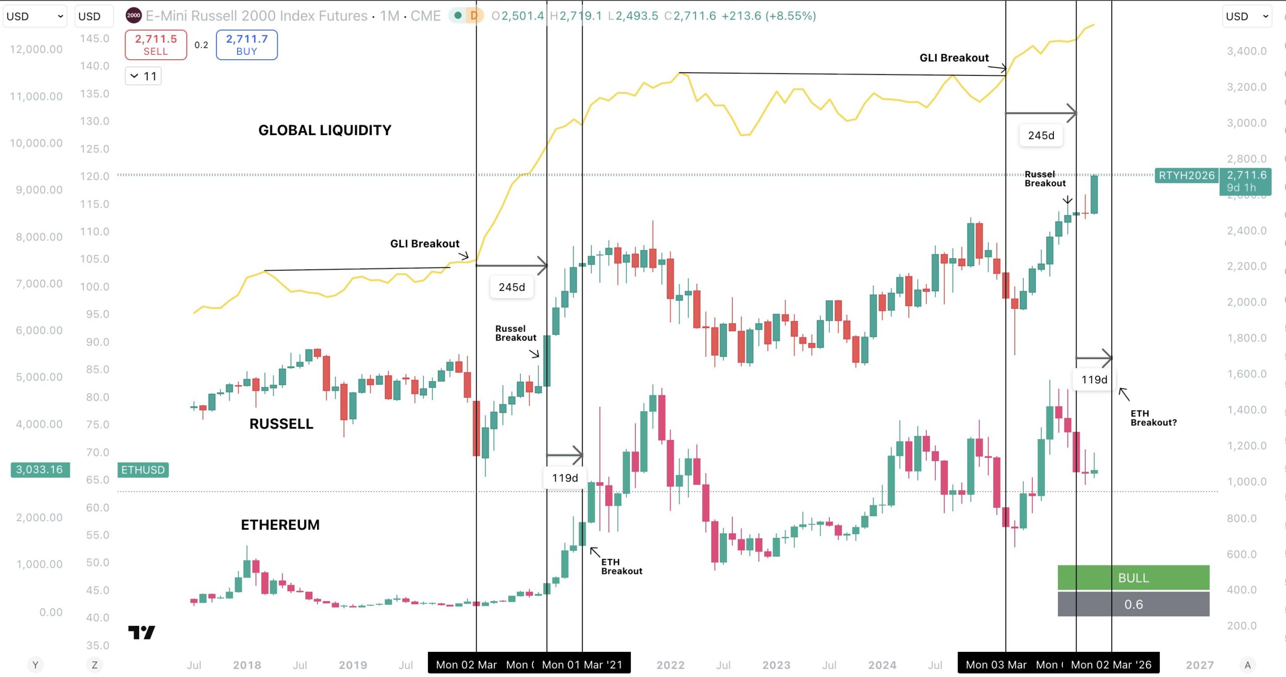 The sequence follows three steps: a breakout in global liquidity, followed by a breakout in the Russell 2000, and then a delayed breakout in Ether. On the current monthly chart, the same order has once again appeared.