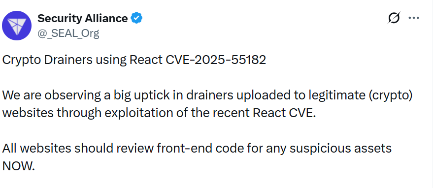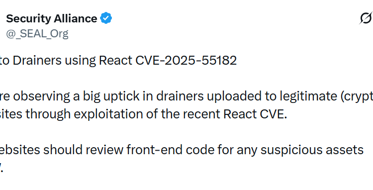 “We are observing a big uptick in drainers uploaded to legitimate crypto websites through exploitation of the recent React CVE. All websites should review front-end code for any suspicious assets NOW,” the SEAL Team said.