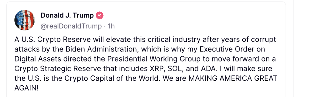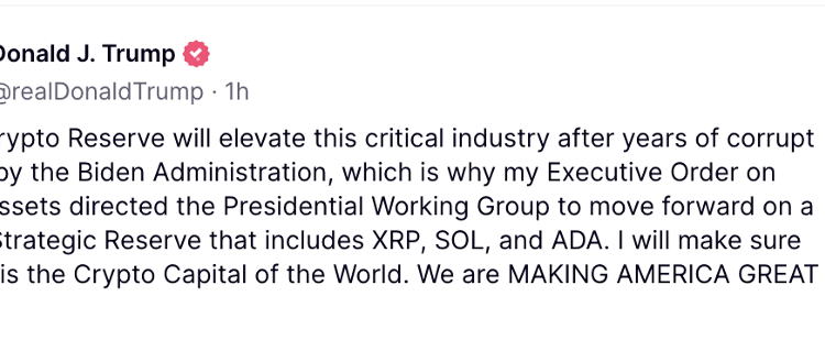 The order of Trump’s two posts on the Truth Social platform also drew scrutiny. Interestingly, the first post mentioned only the projected reserve’s three smallest tokens by market capitalization: XRP (XRP), Solana (SOL) and Cardano (ADA).