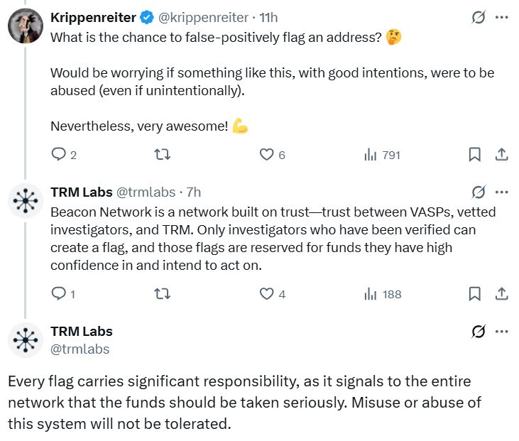 TRM Labs replied to an X user on Wednesday who asked about the network being misused, that only investigators who have been verified can flag funds, and only if they “have high confidence in and intend to act on,” the information.