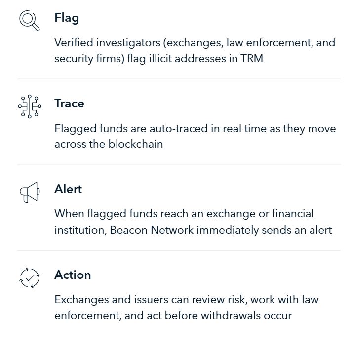Under the Beacon Network, verified members can flag wallet addresses suspected of financial crime, trace the funds across the blockchain, and share information with connected services and law enforcement.