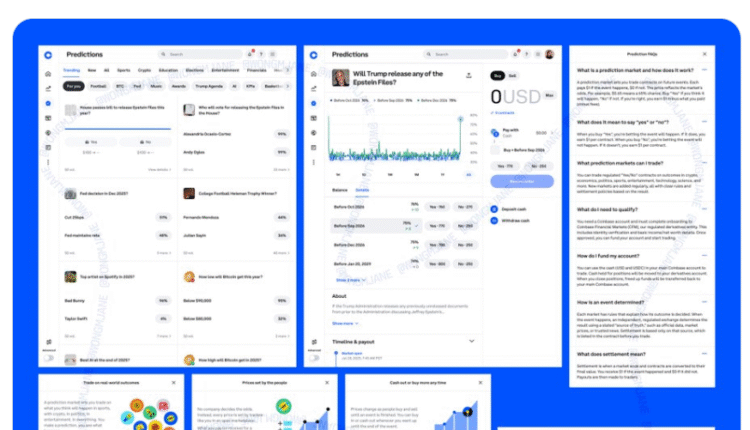 The other images show a typical prediction market interface splashed with Coinbase’s logo, along with an FAQ section and a branded guide explaining the offering.