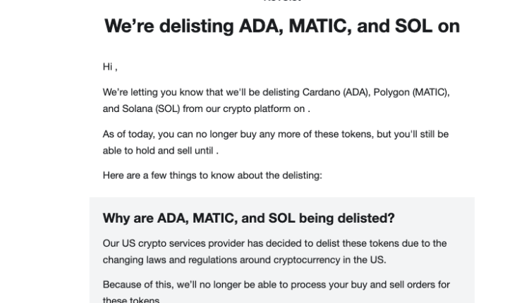 Revolut is not alone in delisting these particular three tokens. Companies like Robinhood, eToro and Bakkt all announced ADA, MATIC and SOL delistings over the past few weeks, immediately halting purchases.