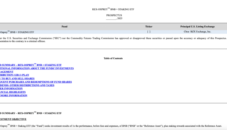 REX Shares and Osprey Funds (REX-Osprey) have filed with the US Securities and Exchange Commission for a BNB exchange-traded fund (ETF) featuring staking yield. The filing comes as asset managers step up their push into crypto ETFs and yield-generating strategies.