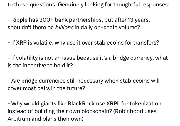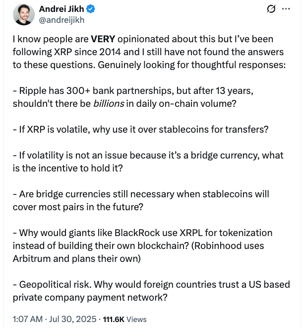 Jikh took to X on Wednesday to voice his multiple concerns about Ripple, including the lack of verifiable on-chain data to support the company’s claim of securing over 300 bank partnerships in its 13 years of operation.