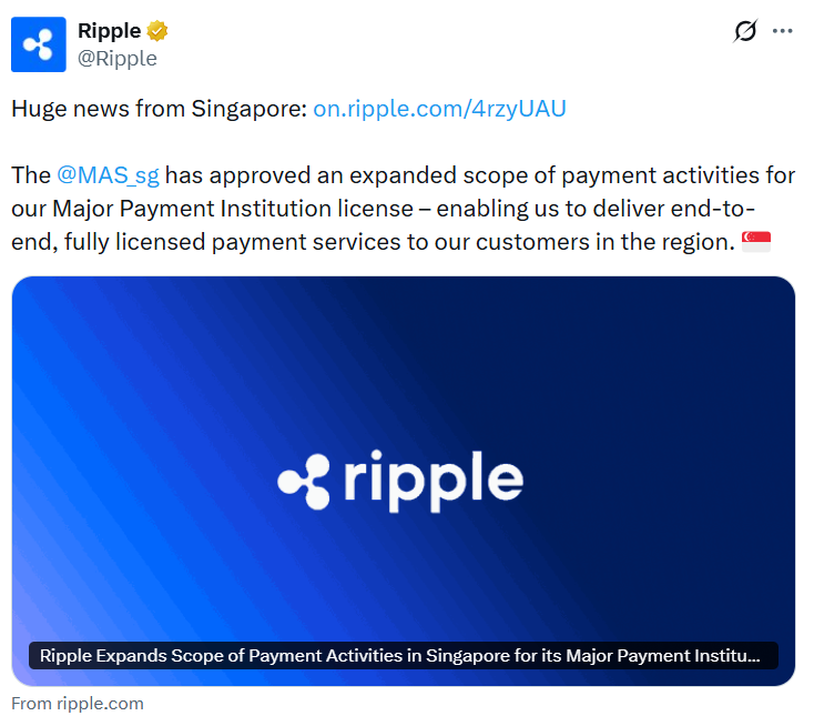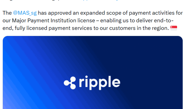 Ripple’s Singapore subsidiary, Ripple Markets APAC, has been approved by the Monetary Authority of Singapore (MAS) to expand the scope of its regulated payment activities under its Major Payment Institution (MPI) license, the company said on Monday.