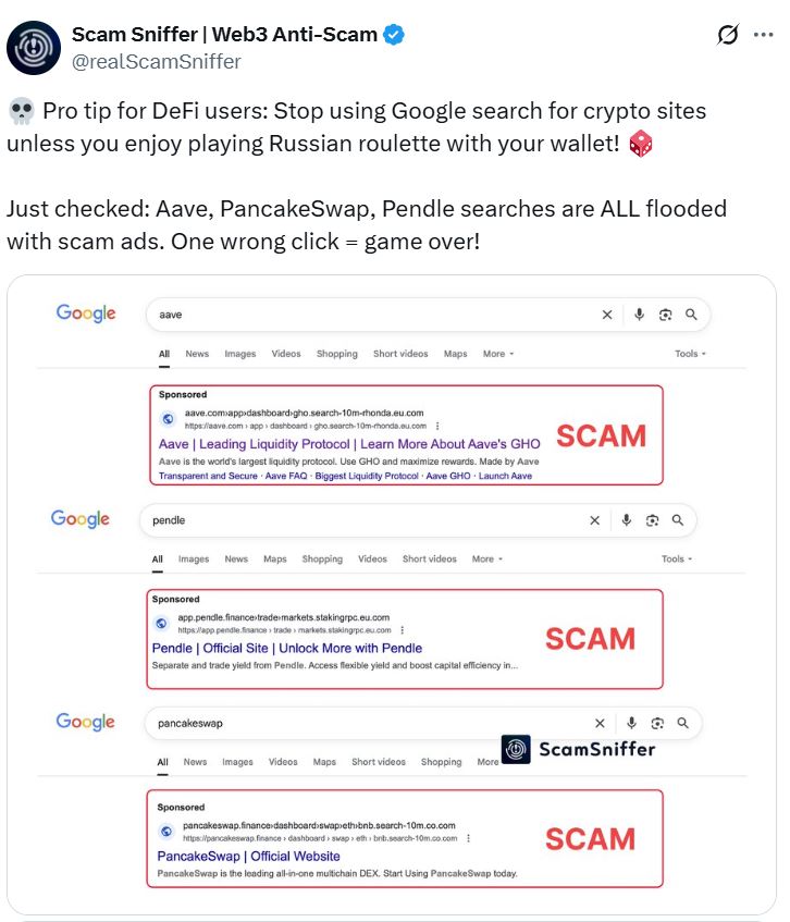 “Pro tip for DeFi users: Stop using Google search for crypto sites unless you enjoy playing Russian roulette with your wallet!” Scam Sniffer said.