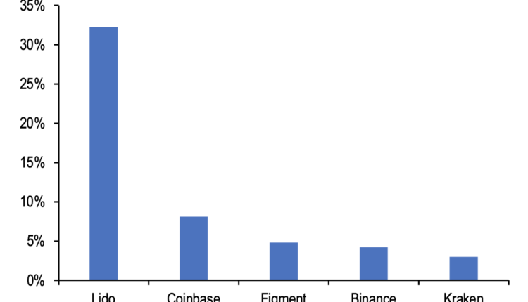 Top five liquid staking providers — including Lido, Coinbase, Figment, Binance and Kraken — control more than 50% of staking on the Ethereum network, JPMorgan analysts noted in the report, adding that Lido alone accounts for almost one-third.