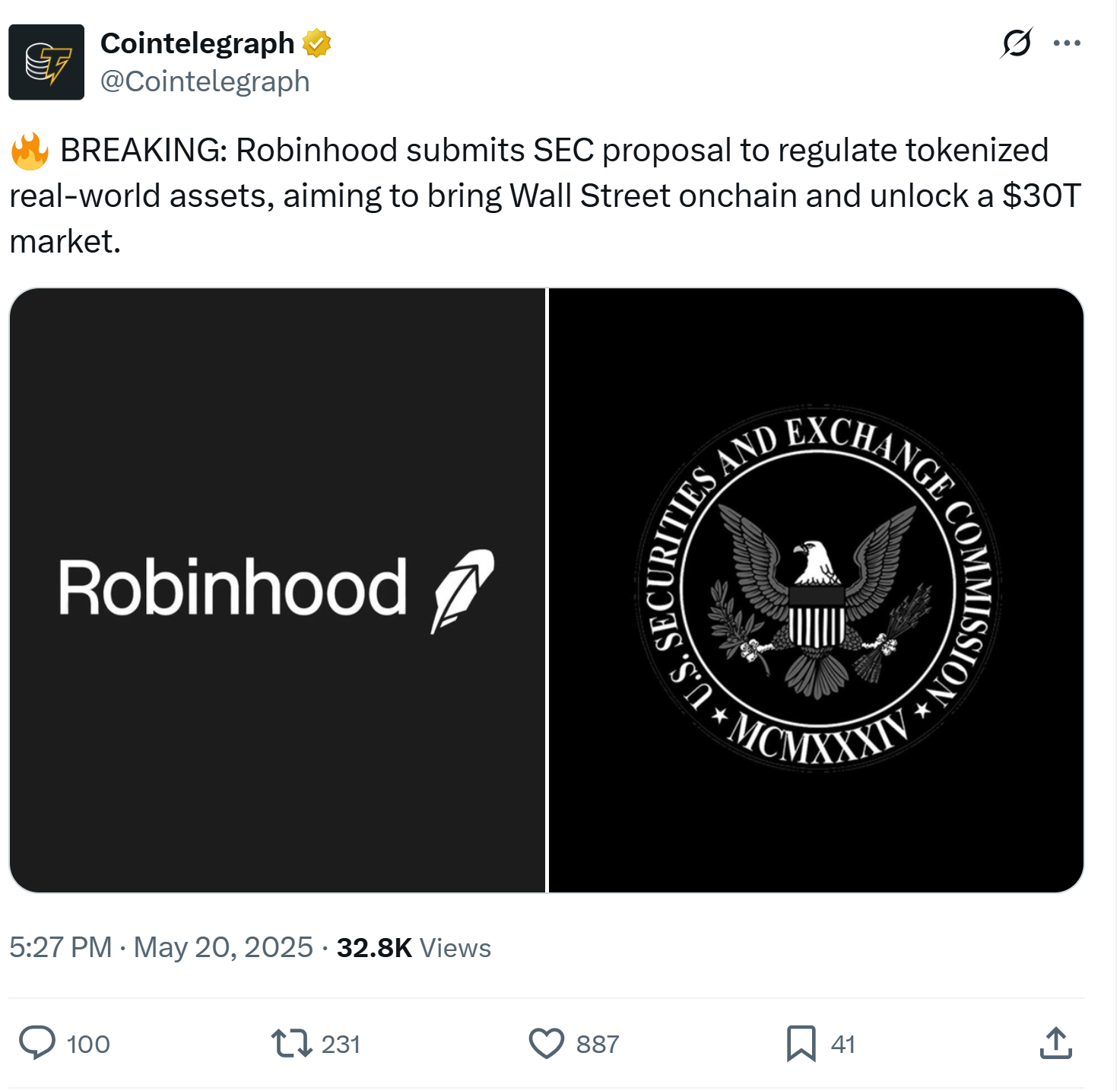 Robinhood has submitted a 42-page proposal to the US Securities and Exchange Commission (SEC), calling for a national framework to regulate tokenized real-world assets (RWAs).