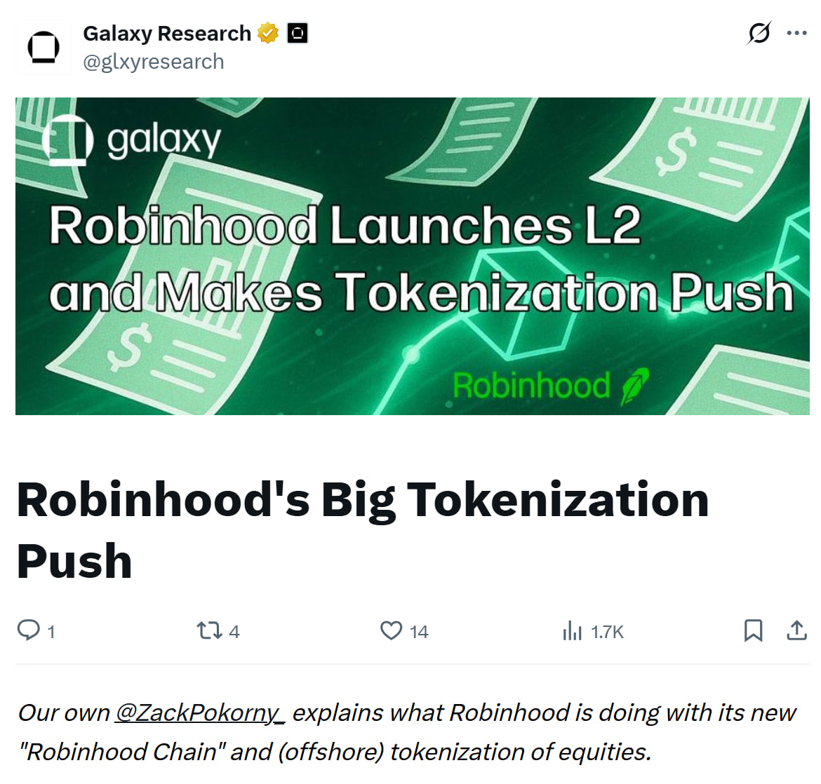 In a Friday report, Galaxy Digital said that Robinhood’s tokenization move removes assets from traditional market channels and brings them onchain, directly challenging the concentrated liquidity and activity that give major TradFi exchanges like the NYSE their edge.