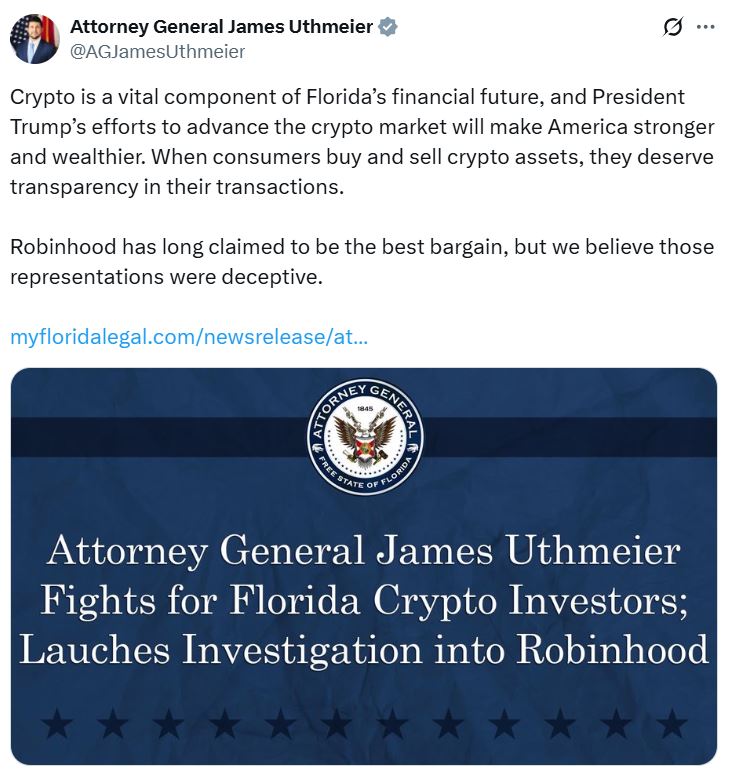 In a statement on Thursday, Florida Attorney General James Uthmeier accused Robinhood of breaking Florida’s Deceptive and Unfair Practices Act and issued a subpoena asking for various documents from the platform.
