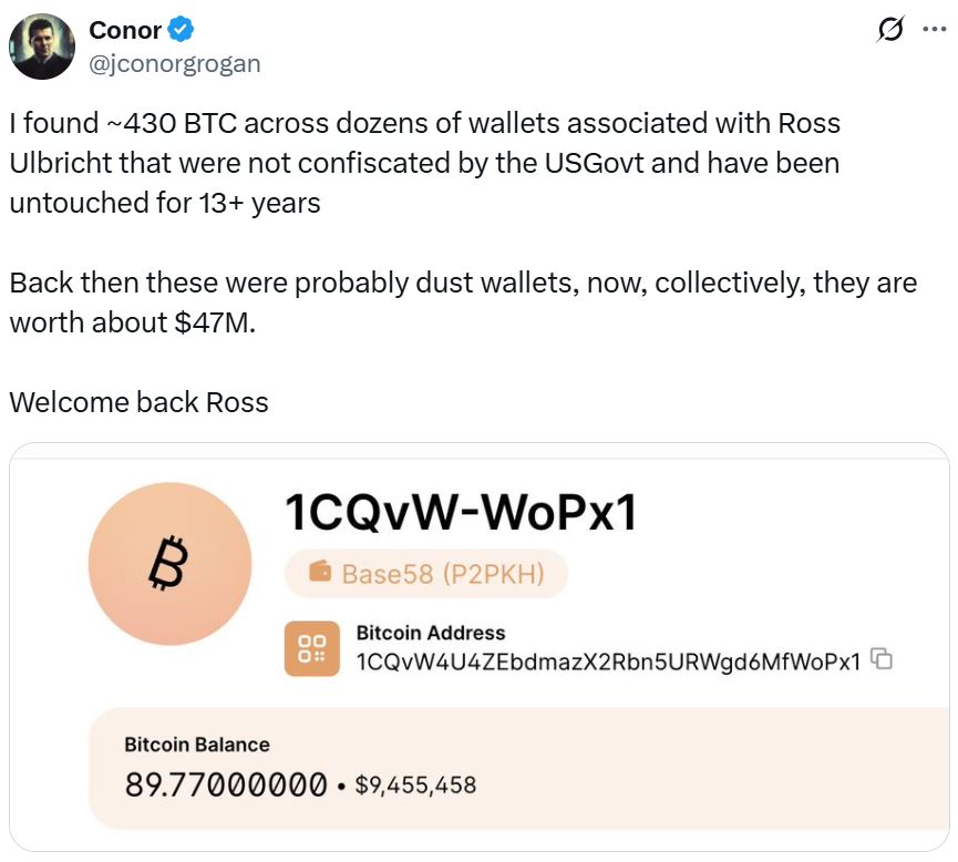 Coinbase director Conor Grogan said in January he found 430 Bitcoin, worth over $45 million, in wallets he claimed were tied to Ulbricht. According to Grogan, the wallets have been inactive for over 13 years and were never seized by authorities.