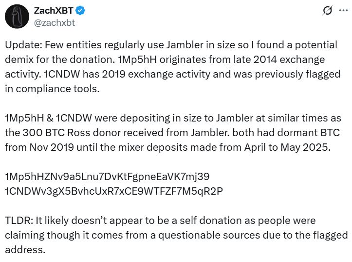“Both were depositing in size to Jambler at similar times as the 300 BTC Ross donor received from Jambler. Both had dormant BTC from Nov 2019 until the mixer deposits made from April to May 2025,” he said.