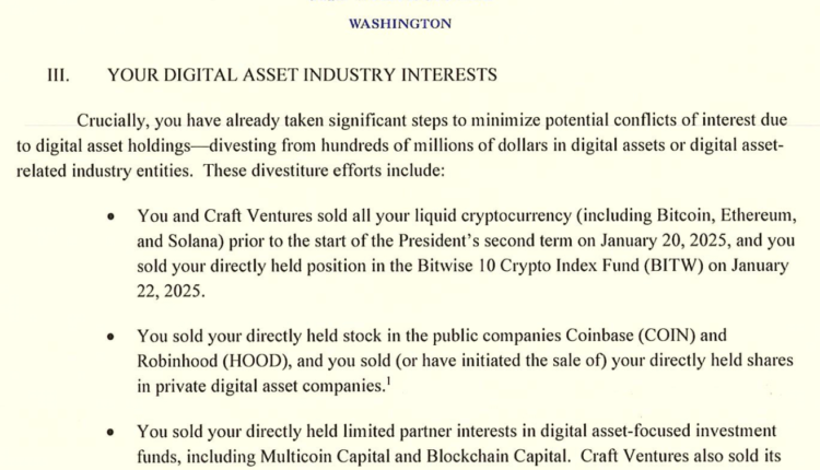 The memorandum said the “significant steps” were taken to reduce potential conflicts of interest before Sacks began his tenure as the White House AI and crypto czar — in which a major part of his role is to help create a legal framework for the crypto industry.