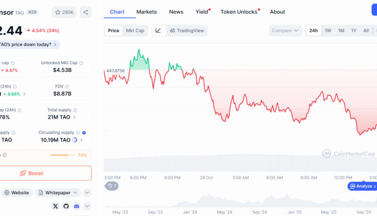 The TAO price has gone down over 4% in the past day. Source: CoinMarketCap