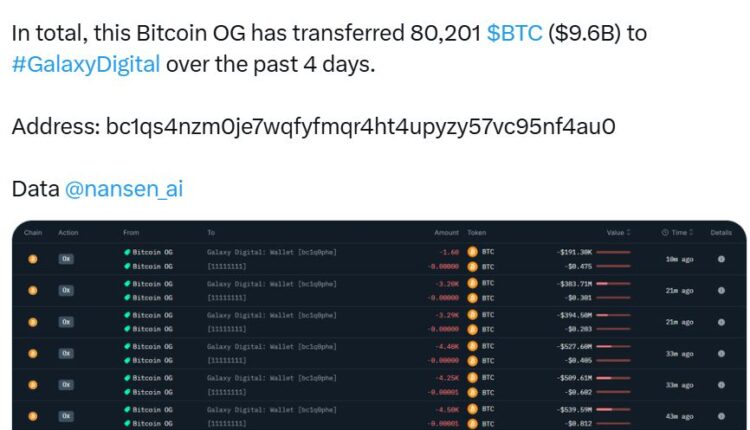 A Satoshi-era Bitcoin whale with 80,201 Bitcoin has shifted the other 40,192 Bitcoin, worth $4.77 billion, to Galaxy Digital, joining a 40,009 BTC transfer to the asset manager on Tuesday.