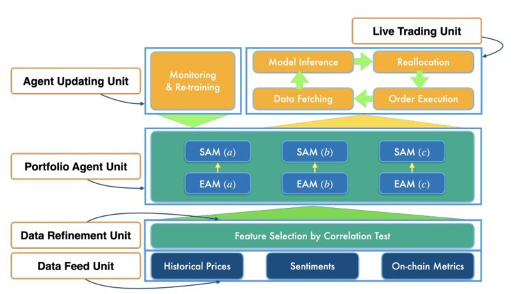 These modules include a Data Feed Unit, Data Refinement Unit, Portfolio Agent Unit, Live Trading Unit, and an Agent Updating Unit.
