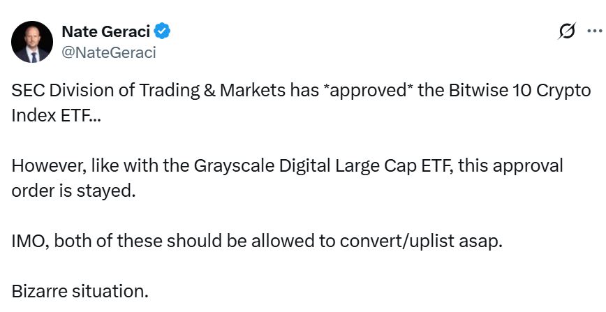 Bloomberg ETF analyst James Seyffart said in an X post on Tuesday that the Bitwise ETF has been “stayed by either one or multiple commissioners. Meaning they cannot actually convert it into an ETF…yet.”