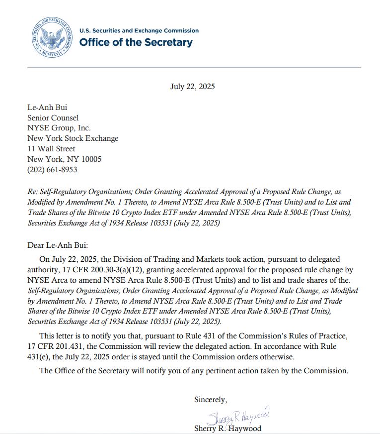 However, in a letter the same day, SEC assistant secretary Sherry Haywood said the “order is stayed until the Commission orders otherwise,” and the “Commission will review the delegated action.”