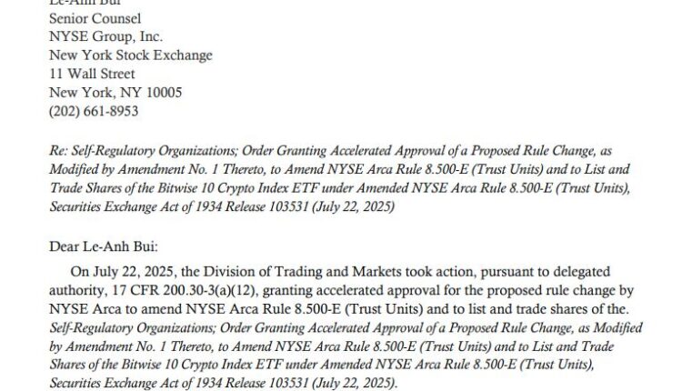 The SEC’s Division of Trading and Markets granted an “accelerated approval” of the Bitwise 10 Crypto Index conversion into an ETF on Tuesday, which means Bitwise could request that the SEC declare the registration effective earlier than the regular timeline.