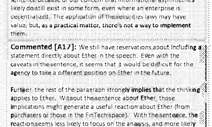 “Even with the caveats in the sentence, it seems that it would be difficult for the agency to take a different position on Ether in the future,” the edits to the documents read. “Further, the rest of the paragraph strongly implies that the thinking applies to Ether.”
