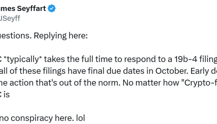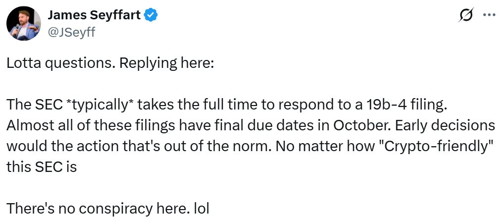 Bloomberg ETF analyst James Seyffart said on X that both delays were expected as the SEC “typically takes the full time to respond to a 19b-4 filing.”