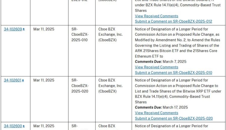Among the affected ETFs are Grayscale’s XRP (XRP) and Cboe BZX Exchange’s spot Solana (SOL) ETF filings, with the decisions on them pushed until May.