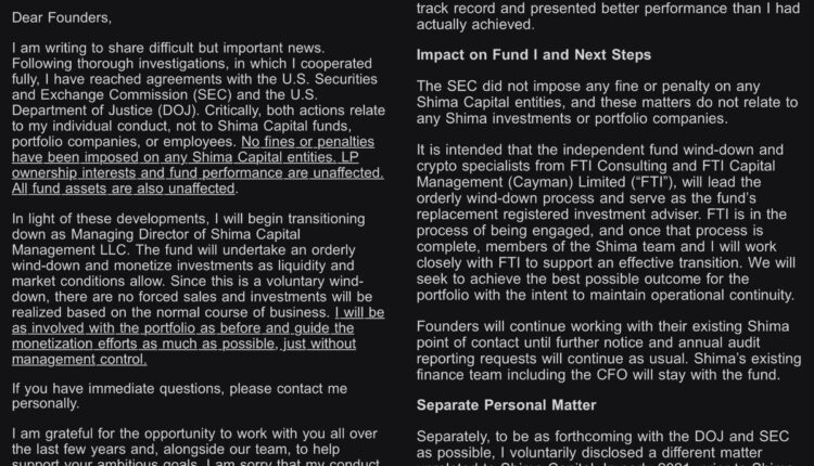 In a Wednesday post on X, crypto journalist Kate Irwin shared screenshots of an email allegedly sent by Gao to portfolio founders. In the screenshots, Gao purportedly said he would step down as managing director of Shima Capital and that the fund would undergo an “orderly wind-down.”