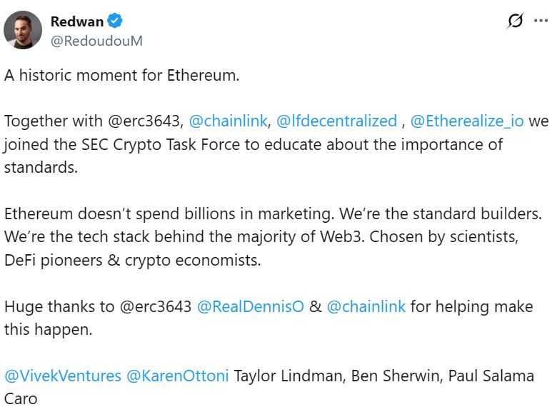 The SEC’s Crypto Task Force met with Ethereum-aligned organizations on Thursday, including the ERC-3643 Association, Chainlink Labs, the Enterprise Ethereum Alliance and Linux Foundation (LF) Decentralized Trust.
