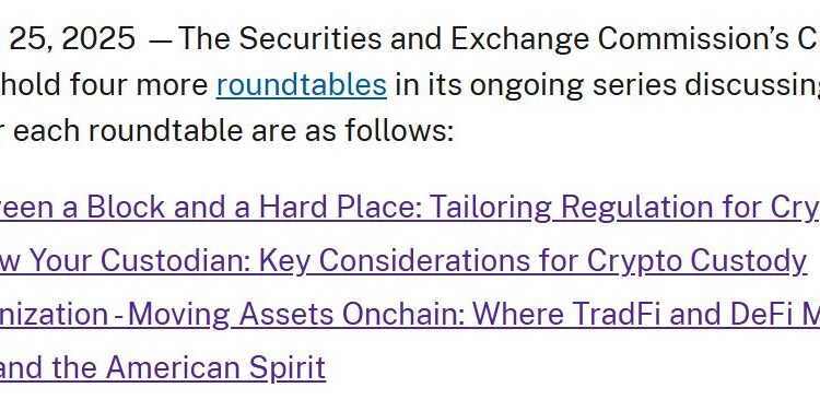 The US Securities and Exchange Commission will host four more crypto roundtables — focusing on crypto trading, custody, tokenization and decentralized finance (DeFi) — after hosting its first crypto roundtable on March 21.