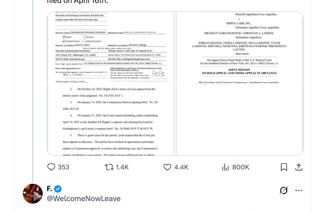 Ripple CEO Brad Garlinghouse previously announced the end of the XRP case on March 19, and the new filing hints that the SEC is ready to settle once nominated and approved Chair Paul Atkins takes office, according to some community speculation.