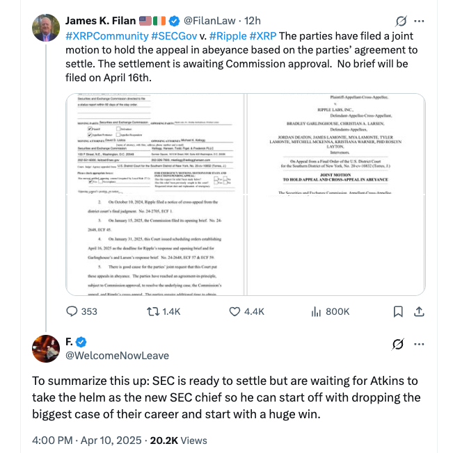 According to Ripple’s defense attorney, James Filan, the new filing supersedes the April 16 deadline for Ripple to respond to the SEC’s brief filed in January. “The settlement is awaiting commission approval. No brief will be filed on April 16,” Filan wrote in an April 10 X post.