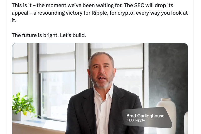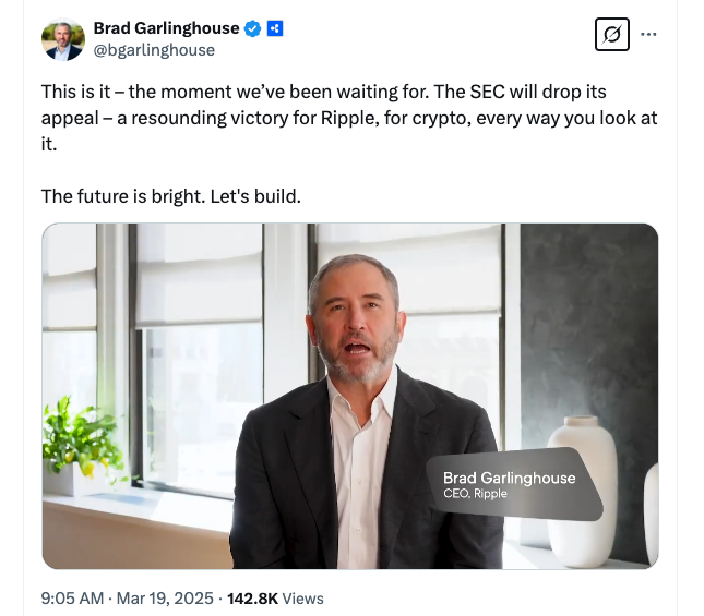 “This is it — the moment we’ve been waiting for. The SEC will drop its appeal — a resounding victory for Ripple, for crypto, every way you look at it,” Ripple CEO Brad Garlinghouse wrote on X on March 19.