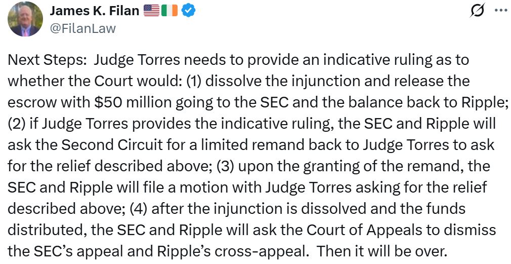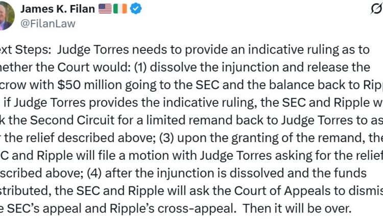 If Torres provides an indicative ruling, the SEC and Ripple will ask the Second Circuit Court of Appeals for a limited remand back to Judge Torres, which, if granted, will result in another motion being filed for the agreed settlement, according to Filan.