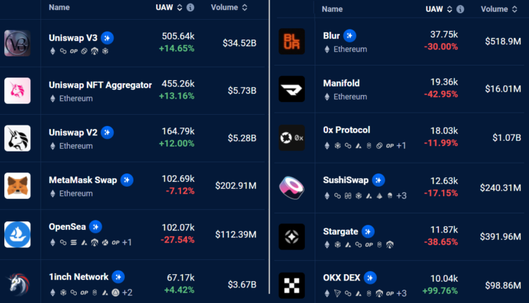 The number of active addresses interacting with decentralized applications (DApps) is also in a slump. Over the last 30 days, the top 12 DApps running on the Ethereum network saw a 4% increase in active addresses, even though the average transaction gas fee remained above $6.5.