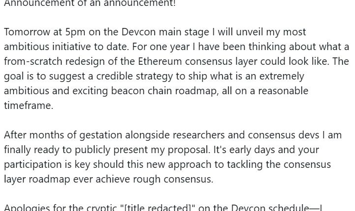 On Nov. 11, Ethereum researcher Justin Drake posted on X that he would announce an “ambitious” initiative for Ethereum. Drake said he had contemplated a “from-scratch” redesign of the Ethereum consensus layer, which some interpret as a step toward solving its scalability issues.