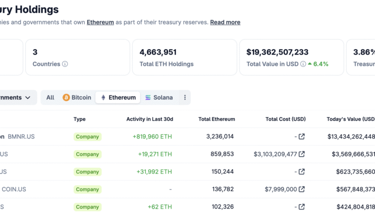 SharpLink is currently the second-largest corporate holder of ETH, with 859,853 ETH worth about $3.57 billion, or 0.71% of total supply, according to CoinGecko data. The planned deployment represents roughly 5.6% of its treasury.