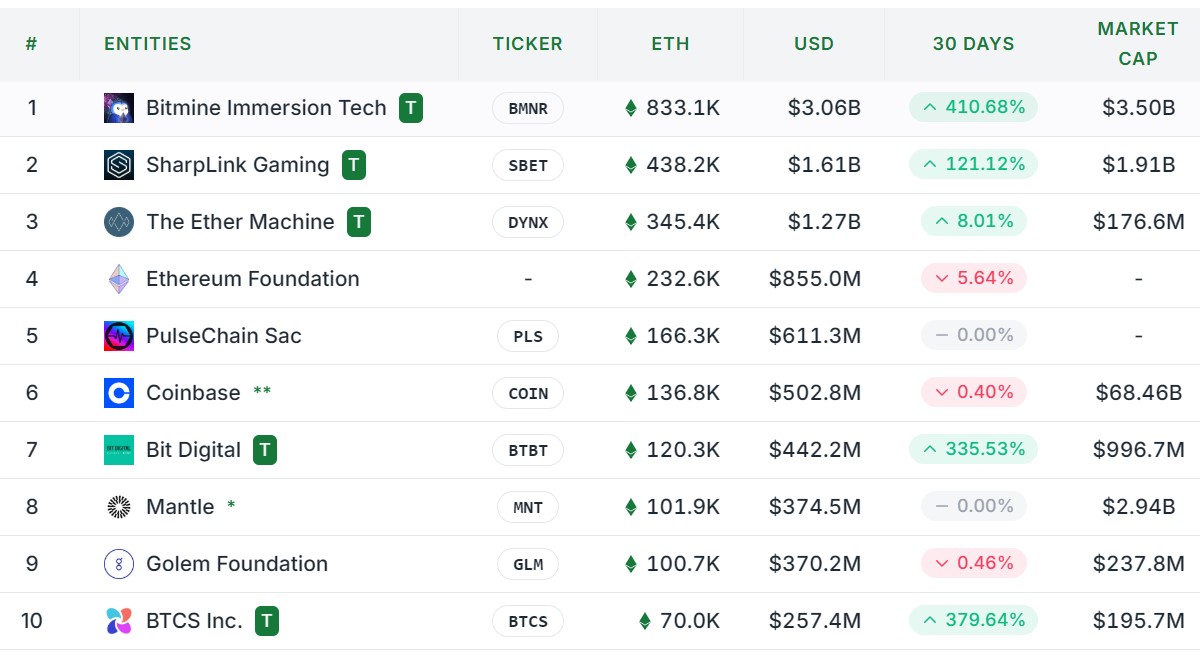 The Ethereum Foundation ranks fourth with 232,600 ETH, valued at $855 million, while PulseChain ranks fifth with 166,300 ETH, worth over $611 million.
