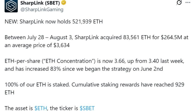 The company measures the success of its ETH strategy through an ETH-per-share metric called ETH Concentration. This shows how much ETH is backed per outstanding share. SharpLink’s ETH concentration is now 3.66, up 83% since it started buying Ether.