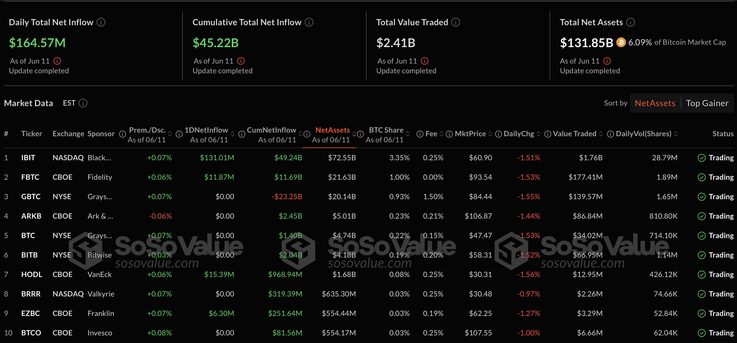 Bitcoin US ETFs, as of June 11. Source: Sosovalue.com