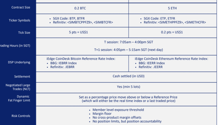 SGX Derivatives is launching Bitcoin (BTC) and Ether (ETH) perpetual futures, which are financial derivatives contracts enabling investors to bet on the spot price of the underlying asset without an expiration date.