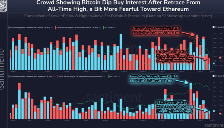 Santiment points to data suggesting crypto community has more interest in buying Bitcoin dip than Ether dip. Source: Santiment
