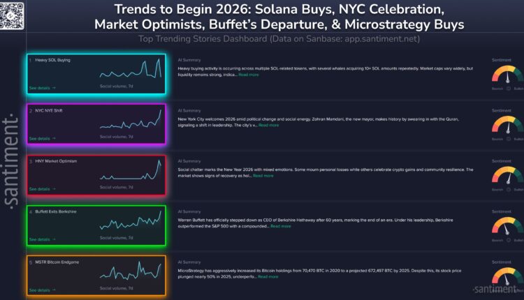 Cryptocurrency markets kicked off 2026 with a focus on Solana, as Santiment data showed discussion regarding whale accumulation of SOL-related tokens as the top trend on Thursday.