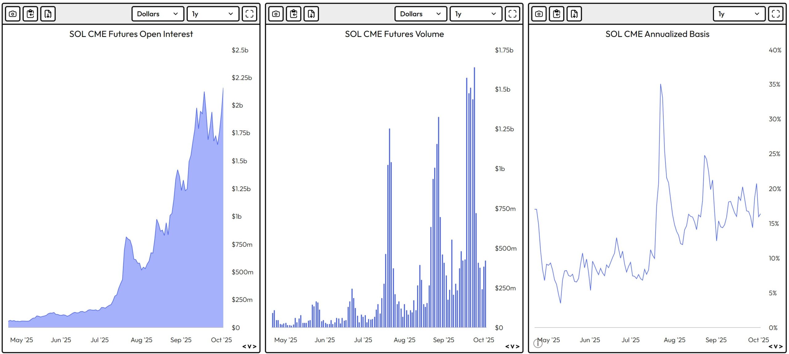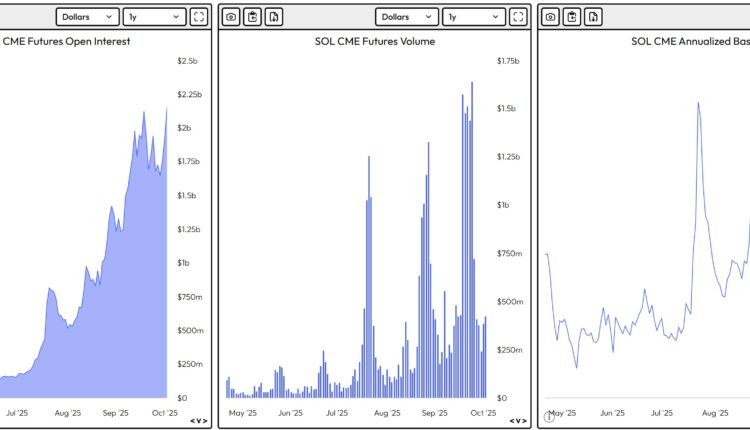 Solana (SOL) futures have entered a pivotal phase, with the Chicago Mercantile Exchange (CME) open interest (OI) reaching an all-time high of $2.16 billion as SOL price rebounded 23% to $235, from a local bottom at $195 on Friday. The timing was notable as institutional volumes surged on CME after SOL established its bottom, demonstrating how market participants are positioning ahead of the SEC’s Oct. 10 SOL ETF decision.