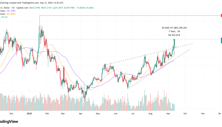 Solana (SOL) is posting one of its strongest weeks of 2025, gaining 17% in the past seven days, trailing only Dogecoin and Hyperliquid among the top 20 crypto assets. The surge puts SOL on track for its highest weekly candle close since January, fueling speculation over a push toward the $300 level.