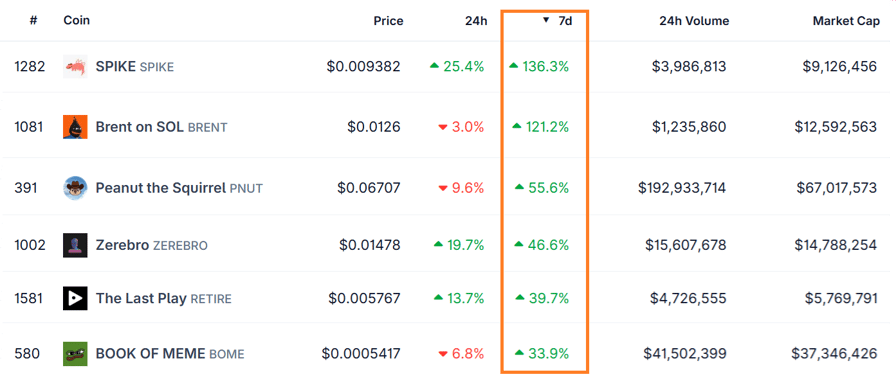 Best performing Solana tokens in 7 days. Source: CoinGecko