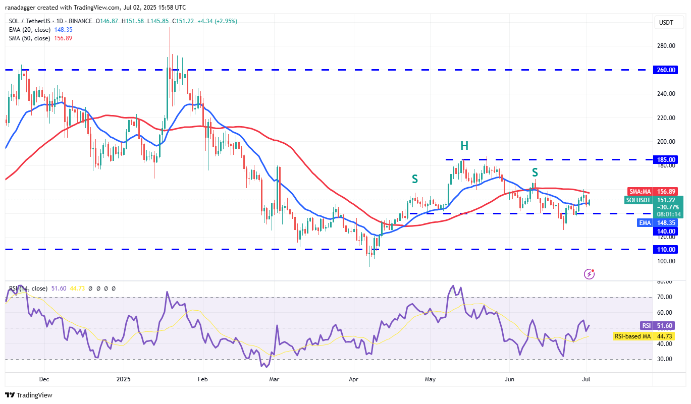 Solana turned down from the 50-day simple moving average ($156) on Monday, indicating that the bears are fiercely defending the level.